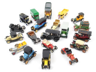 miniatures reproduisant notamment les modèles : RENAULT, ROLLS ROYCE, ITALA (état 'C' avec traces de métal fatigue & déformation) & TALBOT - on y retrouve notamment les marques : MATCHBOX, CORGI TOYS & RIO - quelques manques & parties cassées (plus ou moins importants suivants les modèles)
