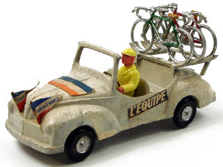 publicités 'L'EQUIPE' - avec conducteur, 2 fanions, 3 vélos & volant en tôle - mauvaise qualité de la peinture d'origine