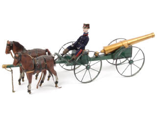 longueur de l'ensemble : 62 cm - réalisation en bois & métal du début du XXème siècle - avec canon de campagne (système de tir à ressort), 2 obus (2 autres manquants), 2 chevaux (quelques petites craquelures par endroits), charrette à munitions & soldat (quelques parties usées) - manque une fixation du tube sur le support roulant (doute sur l'origine) - quelques rayons de roues dessoudés (manques de peinture sur les bandes de roulements) - petits manques par endroits avec accrocs plus ou moins importants