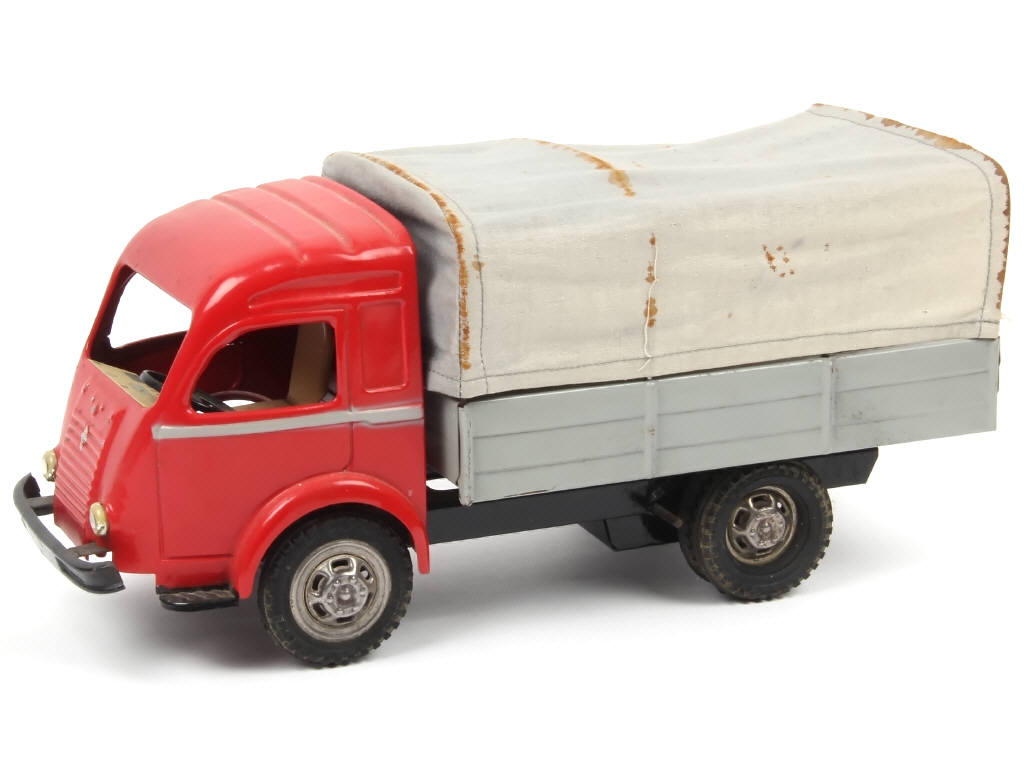 longueur 32 cm - avec moteur à clef (fonctionne) & direction - bâche tachée (oxydation des arceaux) - quelques traces d'oxydation par endroits - pellicule chromée des optiques de phares altérée - légèrement encrassé