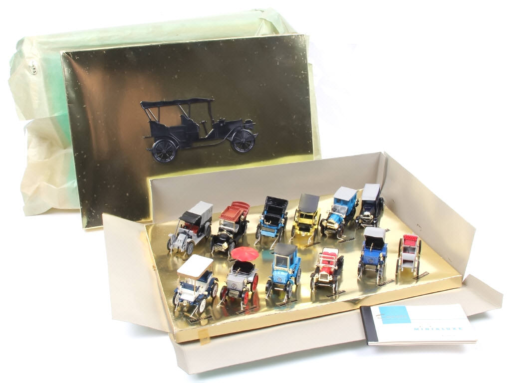 comprend notamment les modèles : CITROËN, RENAULT, FORD & PEUGEOT - modèles présentés sur socle avec ficelle de maintien d'origine & étiquettes de désignation pour chaque véhicule - avec petit catalogue, mica (déformé), couvercle doré avec représentation en plastique d'un tacot & suremballage papier d'origine (avec étiquette 'boite n°3 - déchirures)