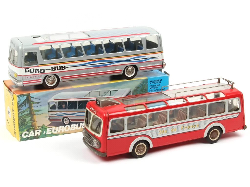 longueur 39 cm - avec moteur à friction (fonctionne), essuie-glaces mobiles actionnés par les roues avant & toit panoramique ouvrant - on y joint un exemplaire 'ILE DE FRANCE' de la marque en état 'C' (moteur à friction fonctionne poussivement, traces d'oxydation plus ou moins importantes, parties ternies, vitrage dégrafé par endroits, sans bagage)