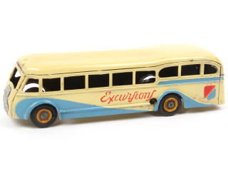 longueur : 23 cm - avec moteur à clef (à revoir), direction & inscriptions '9635-RJ', 'PULLMAN RENAULT' & 'EXCURSIONS' au pochoir - traces d'oxydation plus ou moins importantes sur le bloc-moteur, les jantes, axes de roues & le côté arrière gauche de la carrosserie - un pneu coupé - quelques petits enfoncements sur la calandre & les optiques de phares