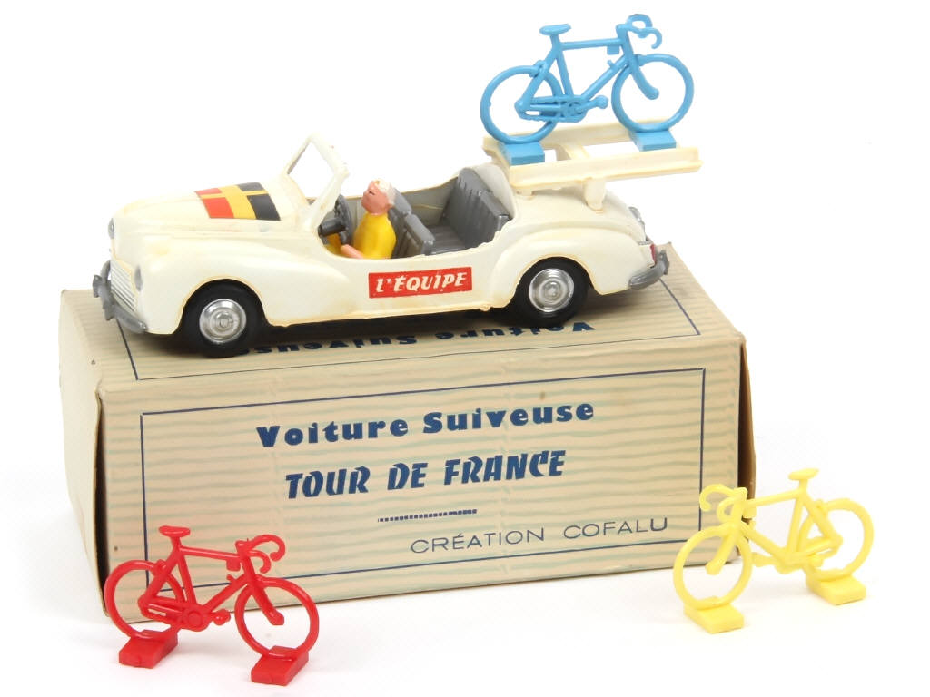 réalisation en plastique - longueur : 14 cm - avec publicités 'L'EQUIPE - LE PARISIEN' - avec conducteur & 3 vélos amovibles sur galerie - carrosserie plus ou moins jaunie par endroits - boîte avec tampon 'SUISSE' sur un rabat (une trace de ruban adhésif sur un autre)