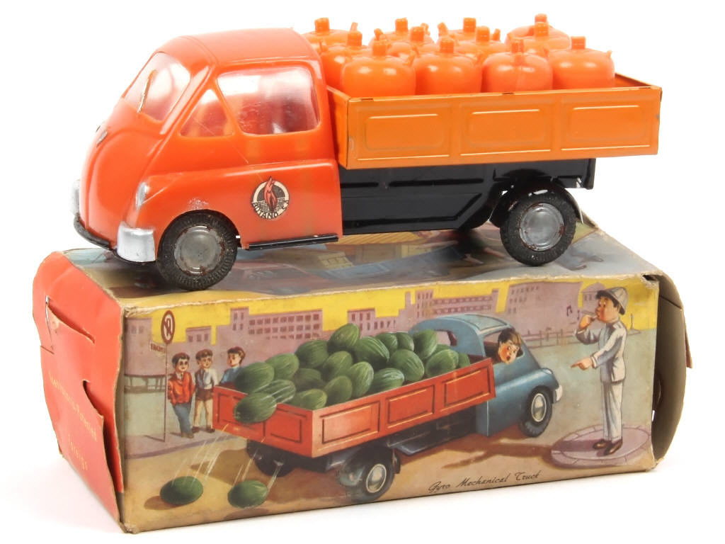 réalisation en plastique & tôle - longueur : 18 cm - avec moteur à friction (fonctionne) & 12 bouteilles de gaz en plastique - légères traces d'oxydation par endroits - quelques petites retouches d'usine sur le plateau - boîte déformée