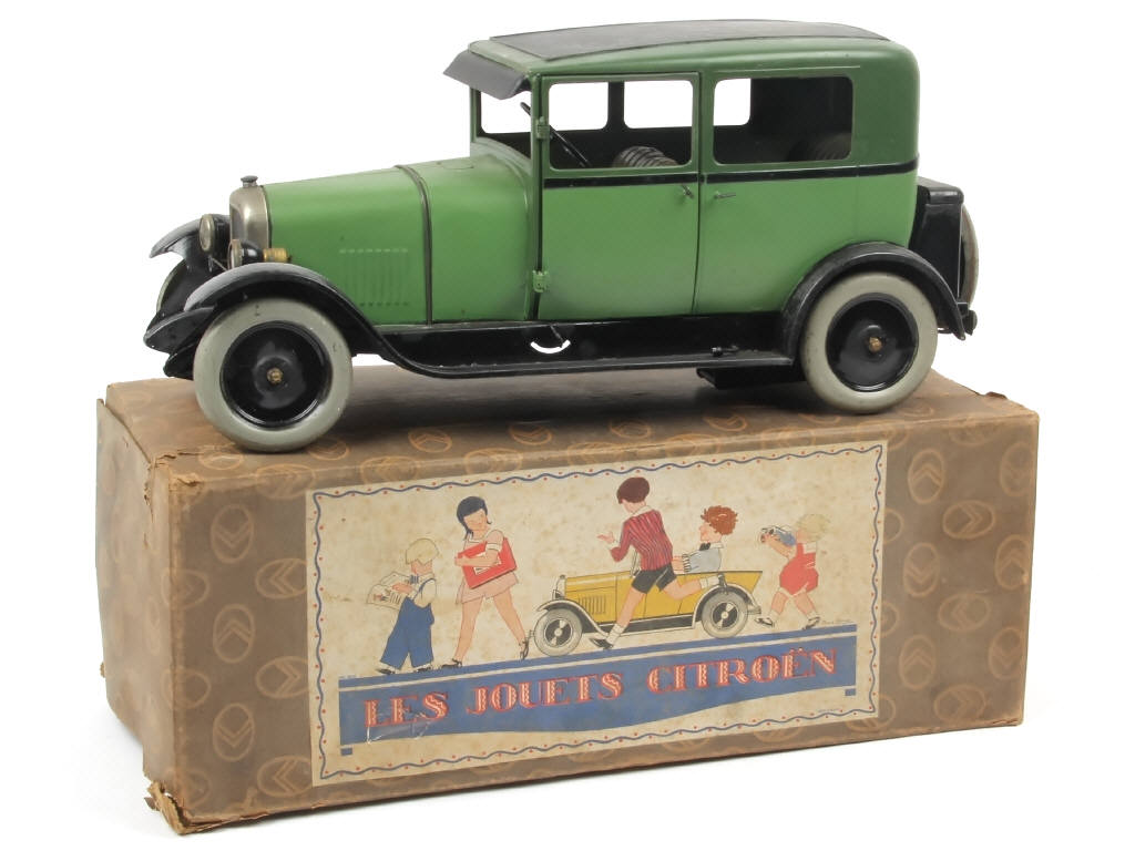 fabrication de 1928 - longueur 40 cm - avec moteur à clef (fonctionne), direction par le volant & phares électriques (non testés) - quelques petites traces d'oxydation par endroits (principalement sur les parties chromées) - manques de peinture sur les pneus - boîte plus ou moins décolorée, déchirée & tachée - TRES BEL ETAT DE PRESENTATION !