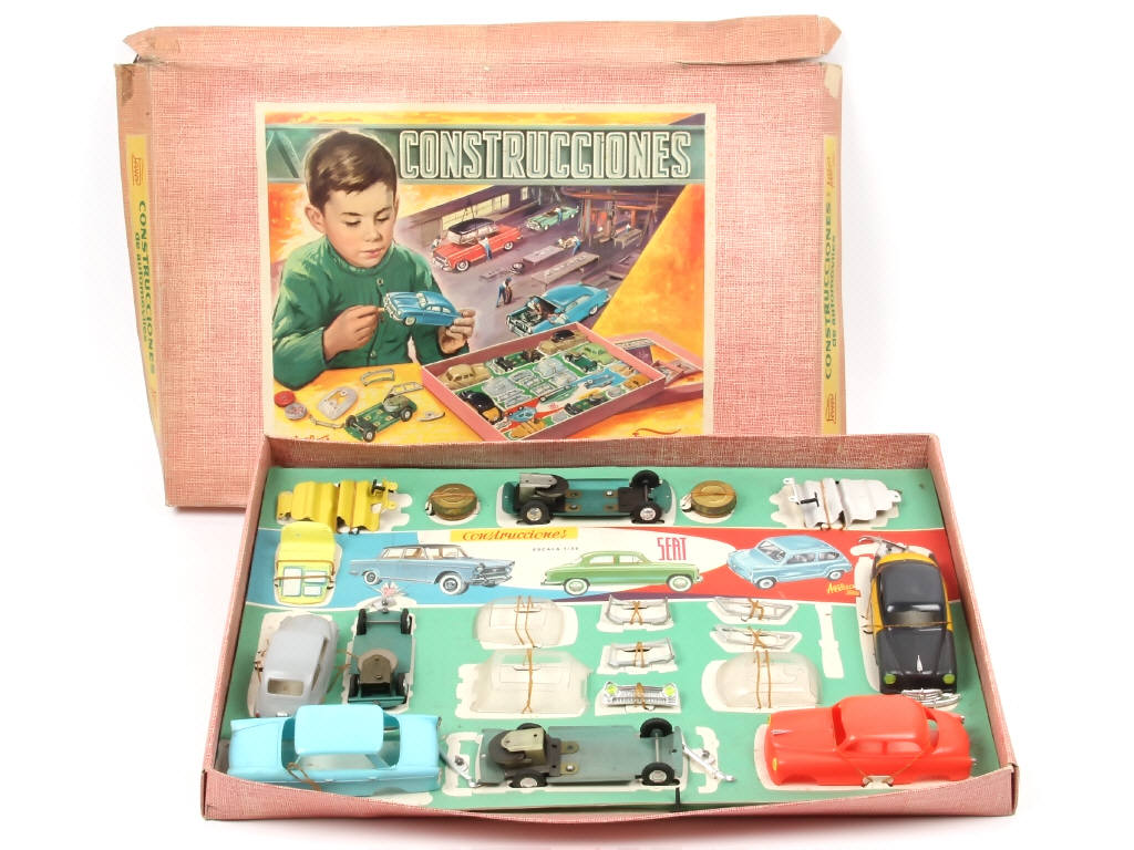 échelle : 1/32ème - semble complet - moteurs à friction non testés - dimensions du coffret : 50 x 34 cm - contient différents éléments de carrosseries de modèles SEAT (un exemplaire en état 'B' avec 2 montants de toit déformés dont un cassé) & accessoires permettant la réalisation de différents types d'automobiles par assemblage (sans notice) - ensemble maintenu sur carton de présentation (quelques fixations incomplètes) - traces de métal fatigue plus ou moins importantes sur les jantes (manques de pellicule chromée) - ensemble plus ou moins encrassé - 2 boîtes à accessoires ternies