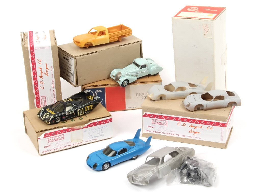 réalisations en résine & en white metal - miniatures reproduisant les modèles : ROLLS ROYCE, PEUGEOT & RONDEAU - on y retrouve notamment les marques : MINI RACING, BELLE EPOQUE & TEAM T - avec manques plus ou moins importants & parties cassées (modèles incomplets) - quelques boîtes non conformes ('b' & 'c')