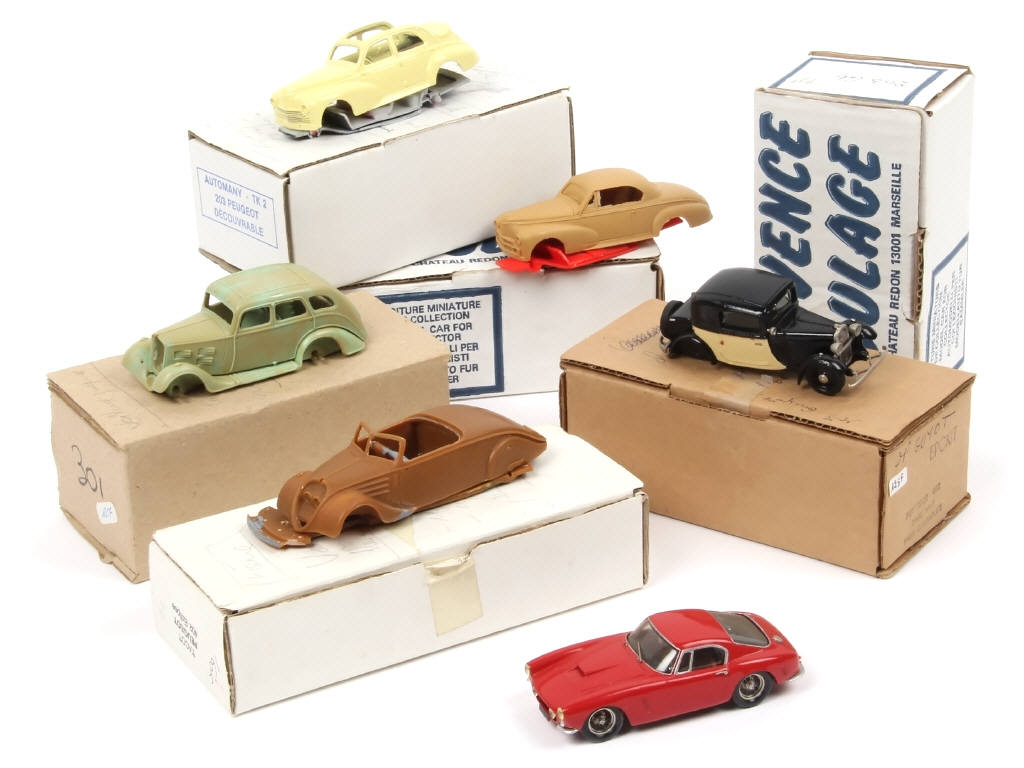 kits en résine (3 exemplaires peints dont 2 montés) - miniatures reproduisant les modèles : PEUGEOT & FERRARI - on y retrouve les marques : AUTOMANY, LATUDE, TACOT, BELLE EPOQUE & M.R.F - avec manques & parties cassées - les boîtes sont en états 'b' & 'c' (dont certaines non d'origine)
