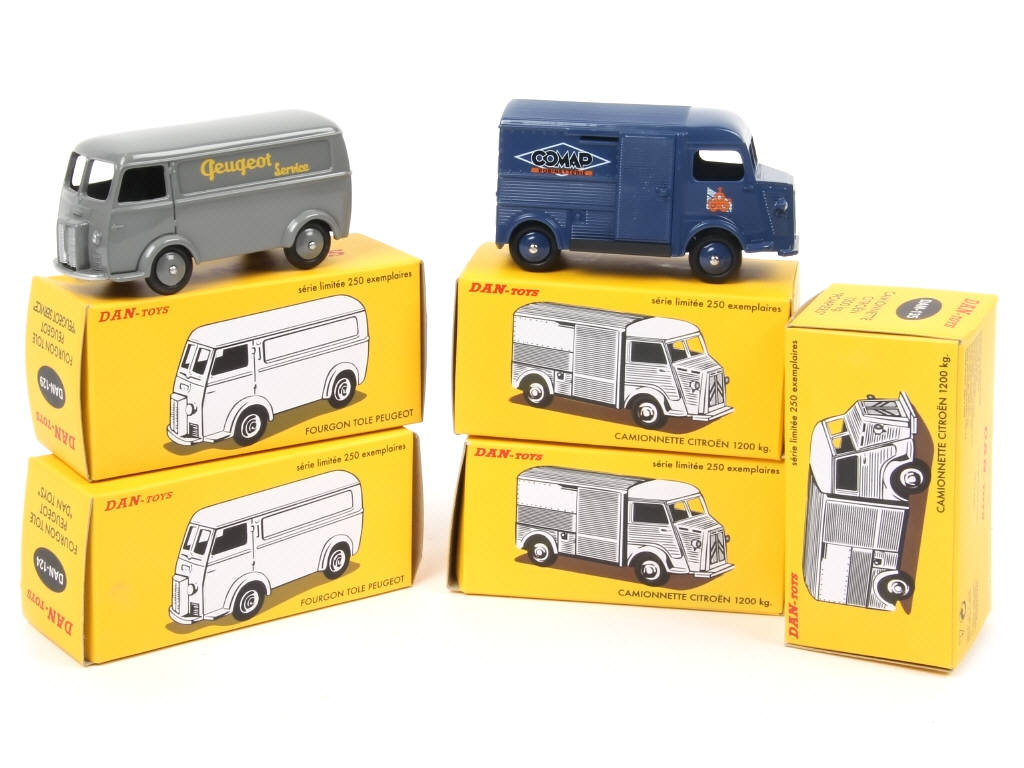 inspiré de modèles DINKY TOYS - séries limitées à 250 exemplaires - comprend : PEUGEOT D3A 'PEUGEOT SERVICE', 'DAN TOYS', CITROËN 1200 KG de pompiers (un caillou de polissage coincé dans la lunette arrière), 'CITROËN SERVICE' & 'COMAP'