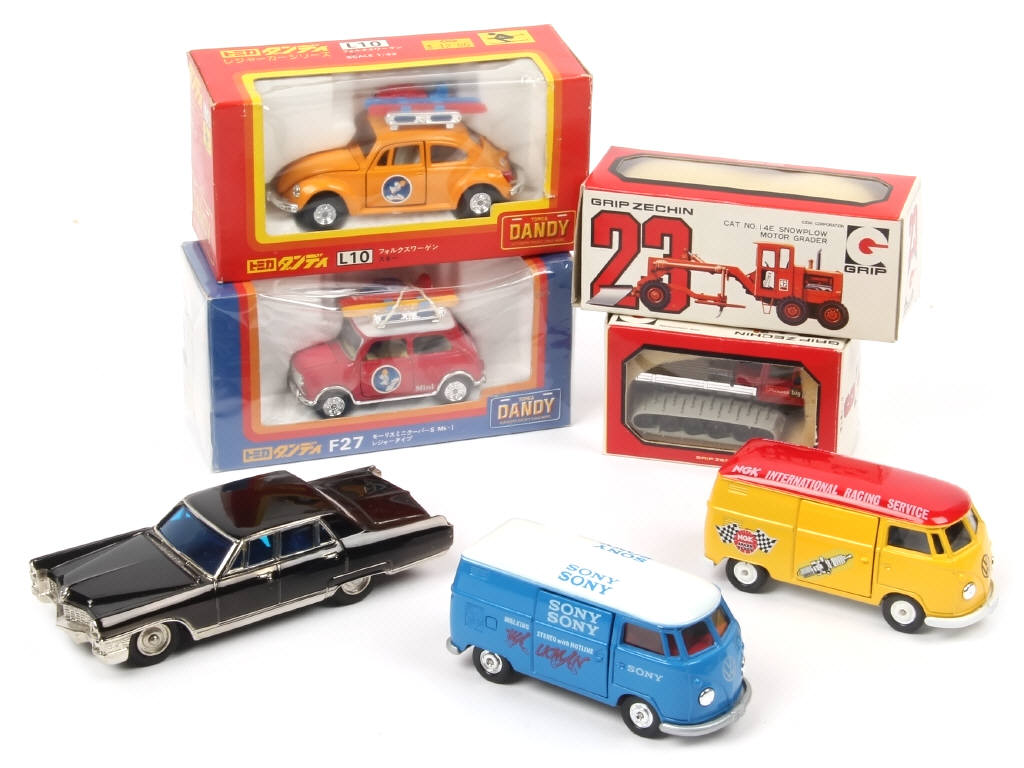 différentes échelles - miniatures reproduisant notamment les modèles : VOLKSWAGEN, CADILLAC & MINI - on y retrouve les marques : TOMICA DANDY, KK SAKURA & EDAÏ GRIP (manque un accessoire, un exemplaire en état 'A-') - 3 exemplaires sans boîte