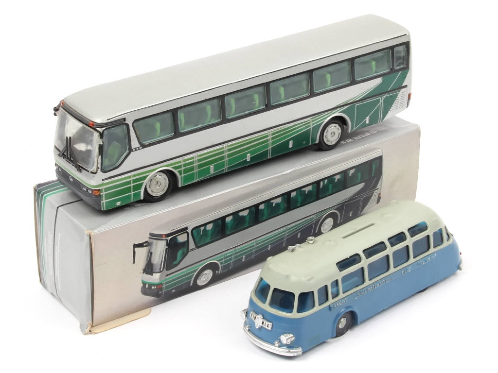 échelle 1/40ème - pare-brise recollé (traces de colle) avec une fixation de rétroviseur cassée - on y joint un autocar 'BANCO TRANSATLANTICO DEL URUGUAY' en état 'B' (réalisation en plastique, modèle faisant office de tirelire, sans clef, RARE !)