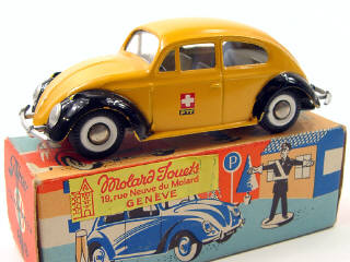 2ème version avec vitres teintées, clignotants au dessus des phares, aménagement intérieur & suspension - boîte avec étiquette du détaillant 'Molard Jouets, 19, rue Neuve du Molard GENEVE'