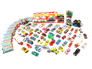 différentes échelles - on y retrouve notamment les marques : MAJORETTE, CORGI & MATCHBOX - comprend notamment les modèles : FERRARI, LAMBORGHINI, MAZDA, PONTIAC & TOYOTA - possibilité de manques et parties cassées - 10 modèles en boîtes en état 'a' à 'b' - on y joint un ensemble important de pochettes MAJOKIT en état 'b'