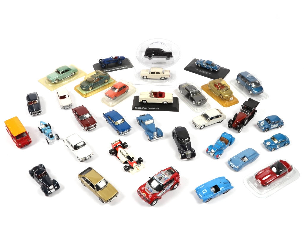 on y retrouve notamment les marques : COLLECTION TEAM, SOLIDO, CORGI, ELIGOR & NOREV - comprend notamment les modèles : PEUGEOT, JAGUAR, CITROËN & MITSUBISHI - 9 modèles en boîtes en état 'a' (dont certaines jaunies) - possibilité de manques & parties cassées
