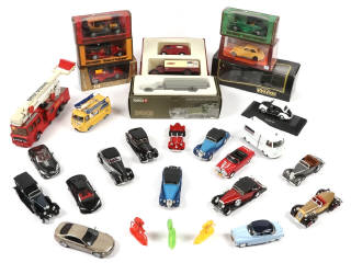on y retrouve notamment les marques : MATCHBOX, SOLIDO, NOREV, CORGI & VEREM - comprend notamment les modèles : PEUGEOT, BMW, SIMCA & DELAHAYE - 9 modèles en boîtes en états de 'a' à 'b' - possibilité de manques & parties cassées - on y joint 3 cyclistes en plastique