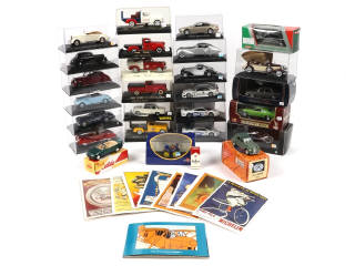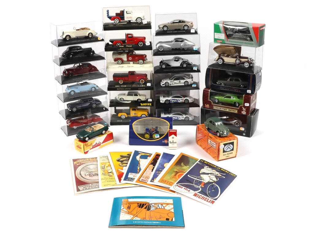 on y retrouve notamment les marques : NOREV, SOLIDO, ALTAYA, SCHABAK & ELIGOR - comprend notamment les modèles : CITROËN, BMW, DODGE, HOTCHKISS & VOISIN - boites en états de 'a' à 'b' - possibilité de manques & parties cassées - on y joint des cartes postales MICHELIN, TINTIN & une boîte d'allumettes vide MARLBORO en état 'b'