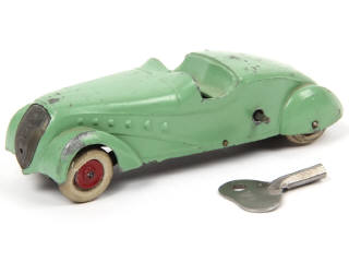 longueur : 11,5 cm - avec moteur à clef (fonctionne) & une clef - pneus séchés & déformés - plancher & calandre ternis avec petites traces d'oxydation sur le moteur - sans volant d'origine