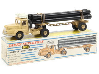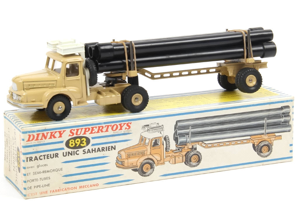 DINKY TOYS (FRANCE) 893 UNIC Saharien transport de pipe-lines (version avec jantes convexes & remorque ajourée) sable & blanc