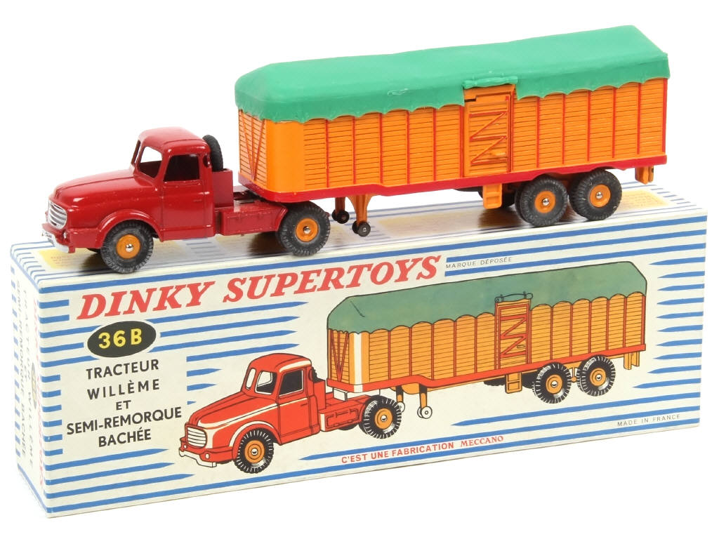 DINKY TOYS (FRANCE) 36B WILLEME Semi-remorque bâché (version avec jantes convexes) rouge & orange, bâche verte