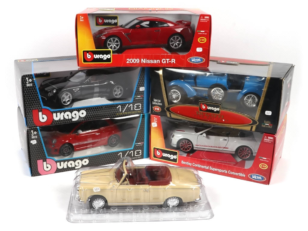 échelle 1/18eme - comprend les modèles : BUGATTI, BENTLEY, FIAT, ALFA ROMEO & NISSAN - on y joint une voiture PEUGEOT 403 cabriolet de la marque SOLIDO en état 'A+.b' - boîtes en état de 'a' à 'b' - possibilité de manques & parties cassées