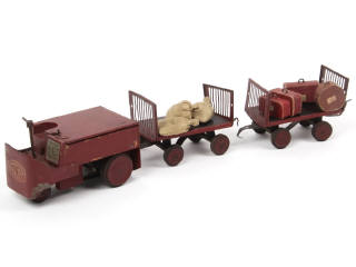 longueur 42 cm - moteur à clef (fonctionne) - fabrication en bois & tôle peinte - avec 4 bagages & 3 sacs - avec manques, parties déformées, non d'origine & traces d'oxydation