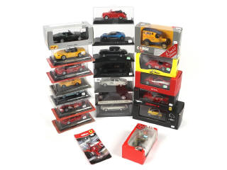 on y retrouve notamment les marques : CORGI, MATTEL, ARTMODEL & ELIGOR - comprend notamment les modèles : PANHARD, VENTURI, RENAULT, FERRARI & JAGUAR - boîtes en états de 'a' à 'b' - possibilité de manques & parties cassées - on y joint un blister ouvert avec un porte-clef FERRARI & une figurine d'ETTORE BUGATTI en état 'A.b'