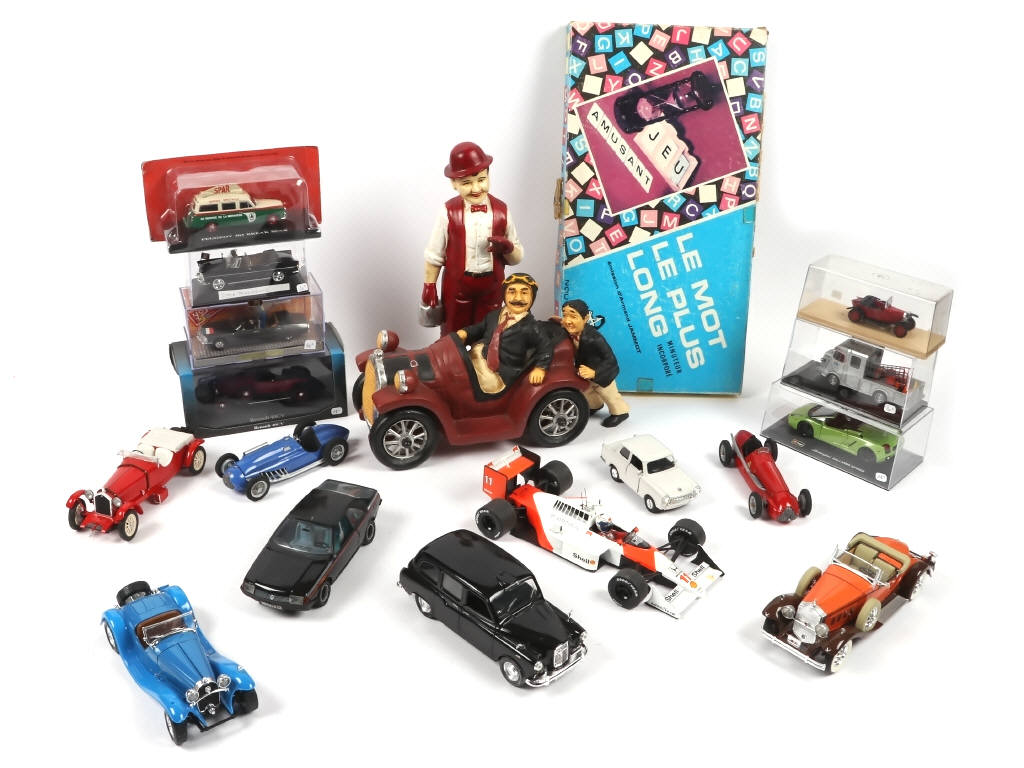 différentes échelles - quelques maquette bien réalisées - on y retrouve notamment les marques : BBURAGO, POLISTIL & NOREV - comprend notamment les modèles : RENAULT, SIMCA, PEUGEOT & HONDA - manques & parties cassées - on y joint un lot de figurines en terre cuite & un jeu de société 'LE MOT LE PLUS LONG'