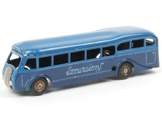 longueur 23 cm - version de 1945 avec calandre 'nid d'abeilles' - avec moteur à clef (fonctionne) & direction - inscriptions 'LES CARS RENAULT & EXCURSIONS' au pochoir - traces d'oxydation sur les jantes & le moteur