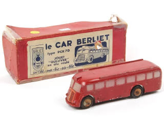 version sans moteur de 1937 - avec décalque 'BERLIET DIESEL' sur la calandre - les roues sont en buis peint à l'extérieur (avec importants manques), brut à l'intérieur - les vitrages sont matérialisés à l'aérographe - pneus craquelés - traces d'oxydation sur les axes de roues - quelques traces d'humidité plus ou moins importantes - manque le fond de boîte (couvercle en mauvais état)