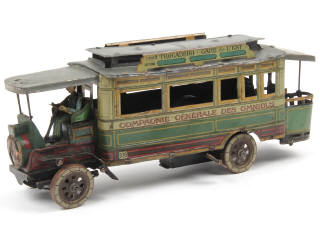 version avec panonceaux de toit latéraux (exemplaires d'extrémité de toit manquants) - il s'agit du premier autobus créé par la marque en 1911 - longueur 29 cm - avec moteur à ressort (fonctionne) & direction - toit repeint - déformations plus ou moins importantes avec traces d'oxydation par endroits - calandre fêlée - manque quelques agrafes