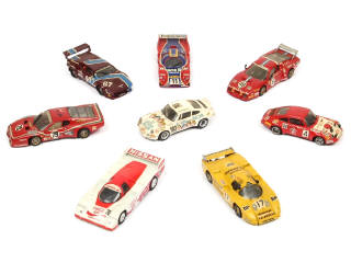kits montés - on y retrouve les marques : SOLIDO (sur base), TOMICA DANDY, SILHOUETTE, TENARIV, TRON & A.M.R. X (plusieurs exemplaires - maquettes André M.RUF) - carrosseries plus ou moins encrassées - petits manques & parties cassées