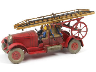 fabriqué de 1931 à 1937 - longueur 43 cm - avec moteur à clef (à revoir), direction, frein & 6 pompiers (non conformes) - parties repeintes (notamment l'intégralité du châssis/ailes), cassées, retouchées, restaurées (éléments non d'origine) & manquantes - quelques traces d'oxydation