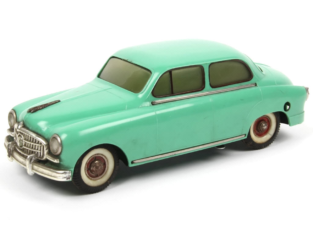 longueur 23,5 cm - avec moteur à clef (fonctionne) & direction - manque pare-choc arrière - enjoliveurs de roues & sigle de calandre plus ou moins oxydés - carrosserie légèrement encrassée (une petite fêlure sur le bas de caisse arrière) - manques de pellicule chromée sur l'entourage de plaque minéralogique arrière