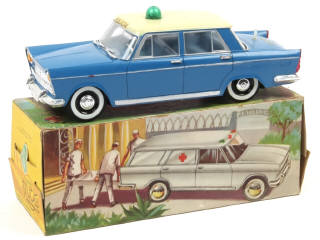 longueur : 23 cm - avec moteur à friction (fonctionne), bruiteur & gyrophare électrique (non testé) - quelques accrocs, taches, annotations & manque de papier sur la boîte