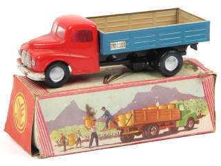 longueur : 20,5 cm - réalisation en plastique & tôle - avec moteur à clef (fonctionne) & direction - quelques petites traces d'oxydation sur le pare-choc avant - boîte tachée & encrassée