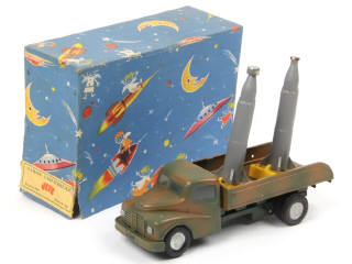 longueur : 21 cm - avec moteur à clef (fonctionne) & 2 missiles (manque un cache-amorce) - un petit défaut de peinture d'origine sur la portière droite - très légères traces d'oxydation sur le plateau - déchirures plus ou moins importantes sur la boîte