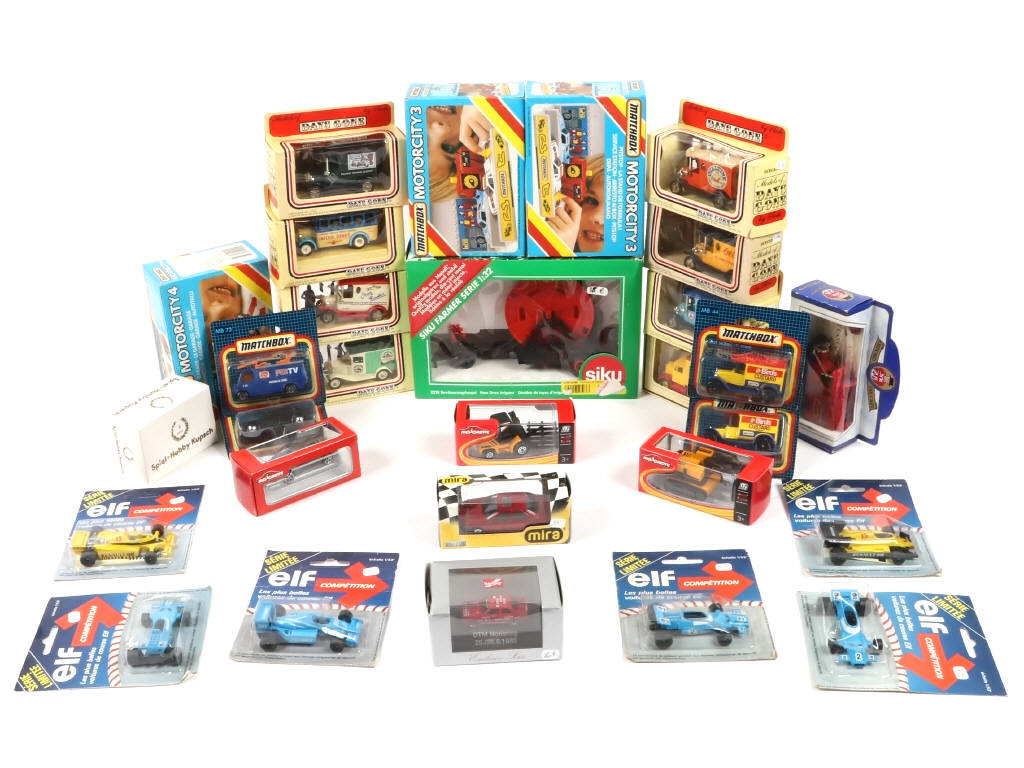petites échelles - on y retrouve notamment les marques : MATCHBOX, LLEDO, HERPA & SIKU - comprend notamment les modèles : VOLKSWAGEN, BMW & RENAULT - possibilité de manques & parties cassées - on y joint 3 boîtes de la marque MATCHBOX gamme MOTIRCITY en état 'a' (dont une fermée avec de l'adhésif, semble complet)