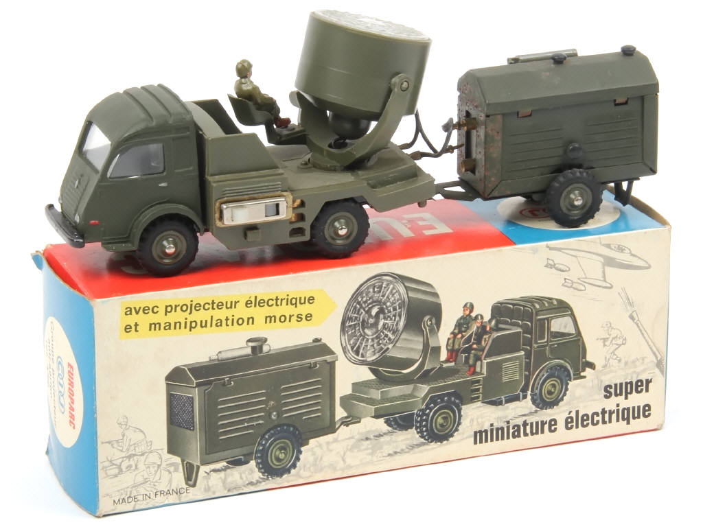 avec remorque groupe électrogène (électrique, traces d'oxydation plus ou moins importantes par endroits), mécanisme de morse lumineux relié au projecteur (non testé), un soldat - importantes traces de métal fatigue avec légère déformation sur le châssis