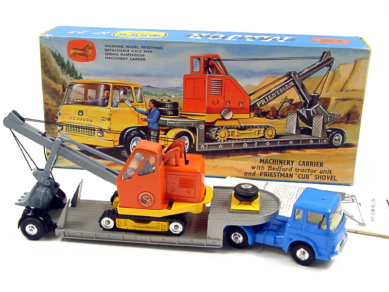 CORGI TOYS (GB) GS27 BEDFORD TK Semi-remorque plateau surbaissé avec pelleteuse PRIESTMAN bleu ciel, gris métal, jaune d'or & orange