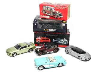 différentes grandes échelles - on y retrouve les marques : AUTOART, REVELL, JOUEF EVOLUTION & BBURAGO (fêlure sur le pare-brise) - quelques accrocs sur les boites (2 modèles sans fixations de socle & un autre sans boite)