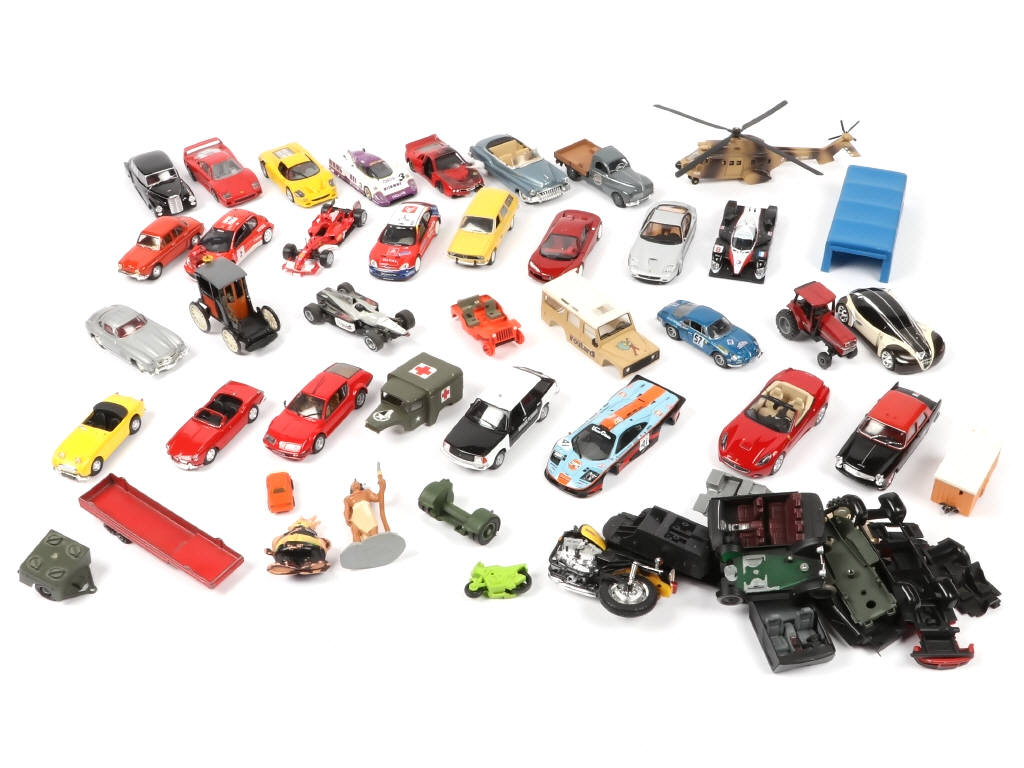 on y retrouve notamment les marques : ALTAYA, NOREV, SOLIDO & DELPRADO - comprend notamment les modèles : FERRARI, PEUGEOT, RENAULT & JAGUAR - manques & parties cassées - on y joint un ensemble de carrosseries & de figurines