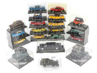 divers modèles de kiosque - comprend notamment les modèles : MERCEDES, CHECKER, VOLVO & TOYOTA - une boîte un peu jaunie - possibilité de manques & parties cassées