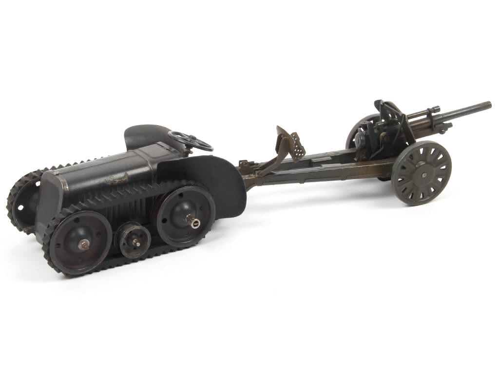 longueur : 17 cm - avec moteur à clef (à revoir) & direction - on y joint un obusier de la marque HAUSSER-ELASTOLIN en état 'C' avec petites restaurations & retouches - quelques petits accessoires manquants
