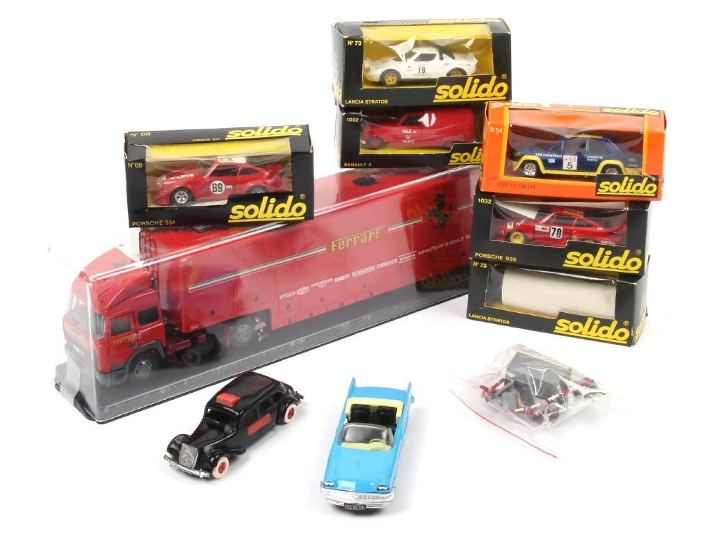 on y retrouve les marques : SOLIDO, OLD CARS & NOREV - 2 exemplaires sans boîte avec carrosseries légèrement déformées (jantes plus ou moins fondues sur un exemplaire) - les boîtes sont en états 'b' & 'c' - décalques apposés sur certains exemplaires - quelques manques & parties cassées - on y joint un sachet de figurines & accessoires