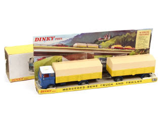 DINKY TOYS (GB) 917 MERCEDES Bâché avec remorque bâchée bleu foncé & jaune, bâches crème
