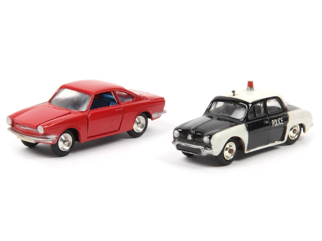 comprend : SIMCA 1000 SPORT (état 'A-', quelques petites retouches d'usine par endroits, sans valise) & RENAULT DAUPHINE 'POLICE' (état 'B', carrosserie légèrement encrassée, quelques petites traces d'oxydation par endroits, suspension arrière affaissée, manques de peinture sur le gyrophare)