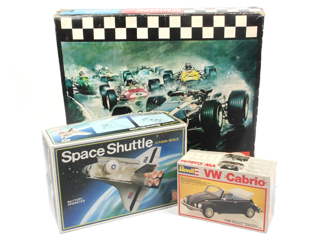 non testé - dimensions du coffret : 58x53 cm (restauré) - contient : différentes voitures (incomplètes) & accessoires - avec manques & parties cassées (pièces détachées) - on y joint une maquette à monter (semble complète) de VOLKSWAGEN COCCINELLE de la marque REVELL (état 'A'-'b') & la navette COLUMBIA (état 'A-'-'c', moteur à piles non testé) de la marque HONG DA - possibilité de petits accessoires manquants