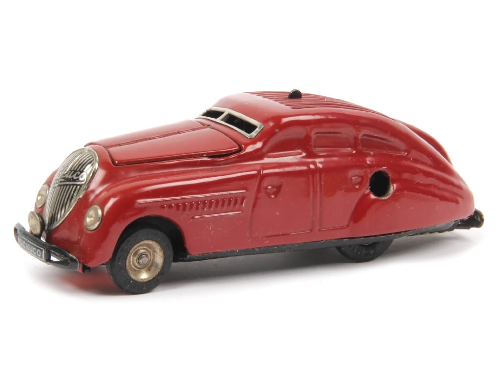 production originale - longueur 14,5 cm - avec moteur à clef (fonctionne) & direction - commande de marche avant/arrière actionnée par le pare-chocs arrière - un éclat sur une extrémité de capot-moteur - très légère décoloration de l'avant de la carrosserie