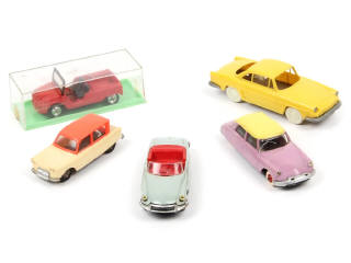 comprend : CITROËN DS19 (2 exemplaires différents dont un avec petites fêlures sur le vitrage & antenne déformée, carrosseries légèrement déformées), AMI 6, MEHARI (en boîte état 'b', quelques accessoires manquants) & RENAULT FLORIDE - quelques parties de pellicules chromées plus ou moins altérées - on y retrouve les marques : BS, NOREV & MINIALUXE